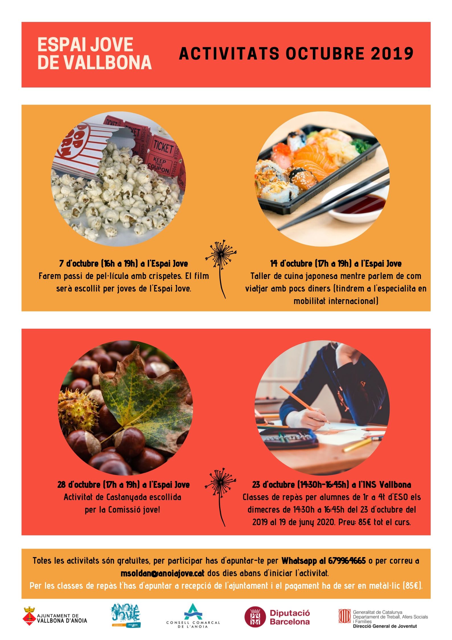 Aquest octubre a l’Espai jove de Vallbona es realitzen activitats ben variades. Cinema amb crispetes, taller de cuina amb informació relacionada en viatjar amb pocs diners, i una activitat a triar pels joves de l’Espai jove relacionada amb la Castanyada. Totes les activitats són gratuïtes, apunta’t al Whatsapp 679.96.46.65!