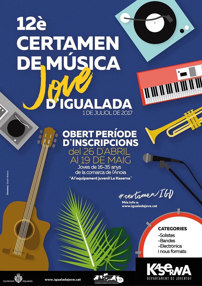 Si tens entre 16 i 35 anys i ets d’Igualada o de qualsevol altre municipi de la comarca de l’Anoia, del 26 d’abril fins al 19 de maig pots inscriure’t al 12è Certamen de Música Jove!!