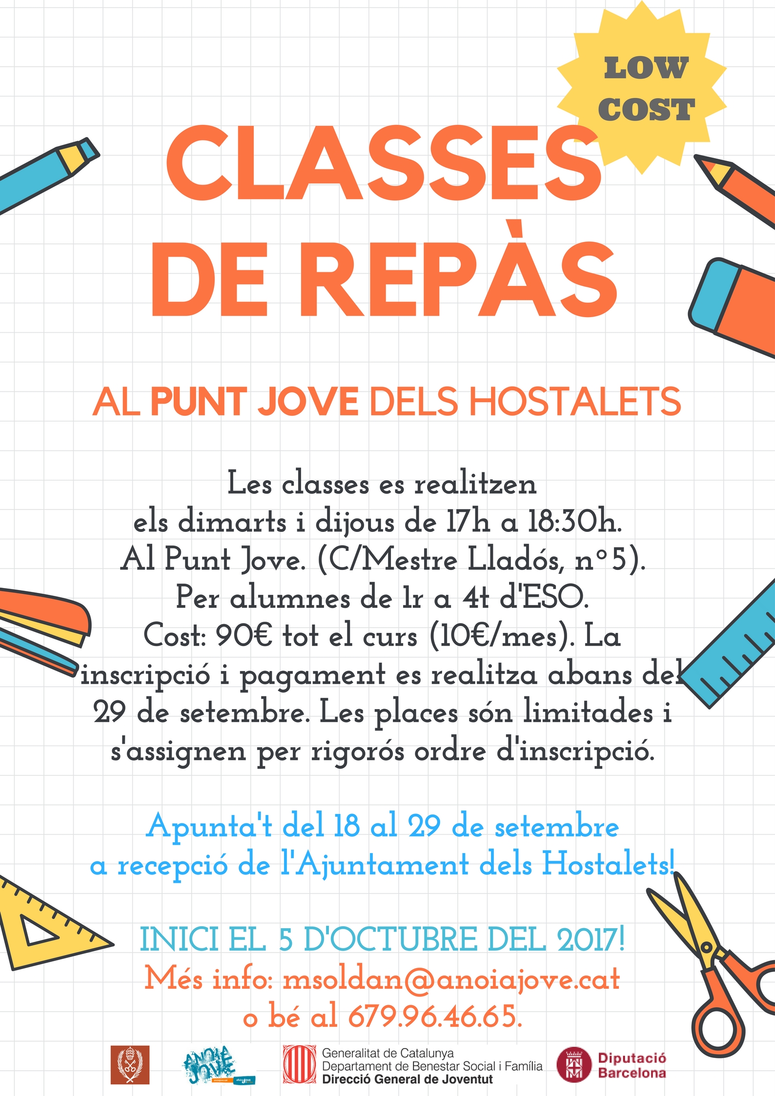Enguany es tornen a oferir classes del repàs acadèmic per als alumnes de l’ESO. Les classes es realitzaran els dimarts i dijous de 17h a 18:30h al Punt Jove (C/ Mestre Lladós, 5). Estan dirigides a alumnes de 4t d’ESO.