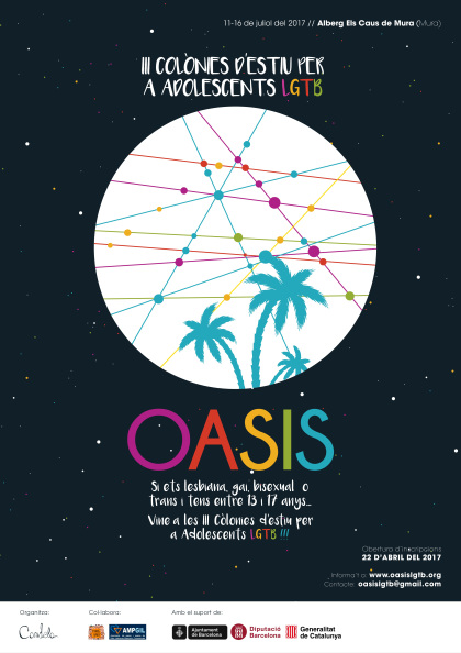 Ja està en marxa la III edició de les Colònies d’Estiu per a adolescents LGTB Oasis, un espai lúdic de trobada i sociabilitat per adolescents amb comportaments, identitats de gènere i sexualitats diverses i que té com a principals objectius acompanyar processos d’apoderament, crear xarxa d’amistats i referents LGTB o generar habilitats de relació i comunicació entre les persones adolescents.