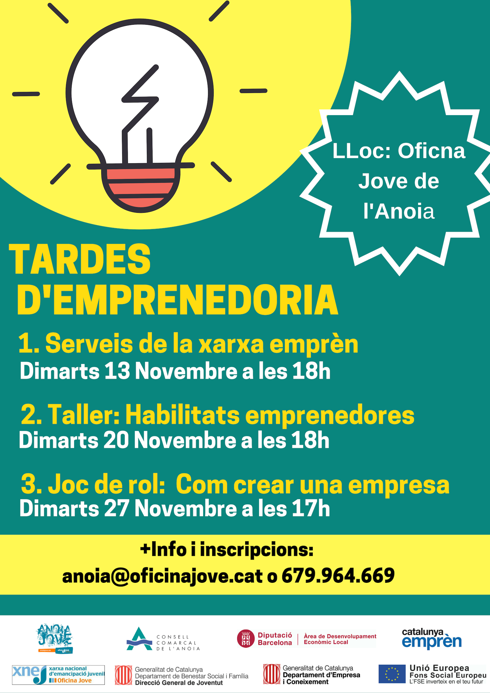 En la primera sessió “Serveis de la Xarxa Emprèn“, s’informarà i s’orientarà sobre els diferents serveis de la comarca de l’Anoia i quines ajudes poden tenir els i les joves per posar en marxa el seu projecte. Es durà a terme el dimarts 13 de novembre a les 18h.