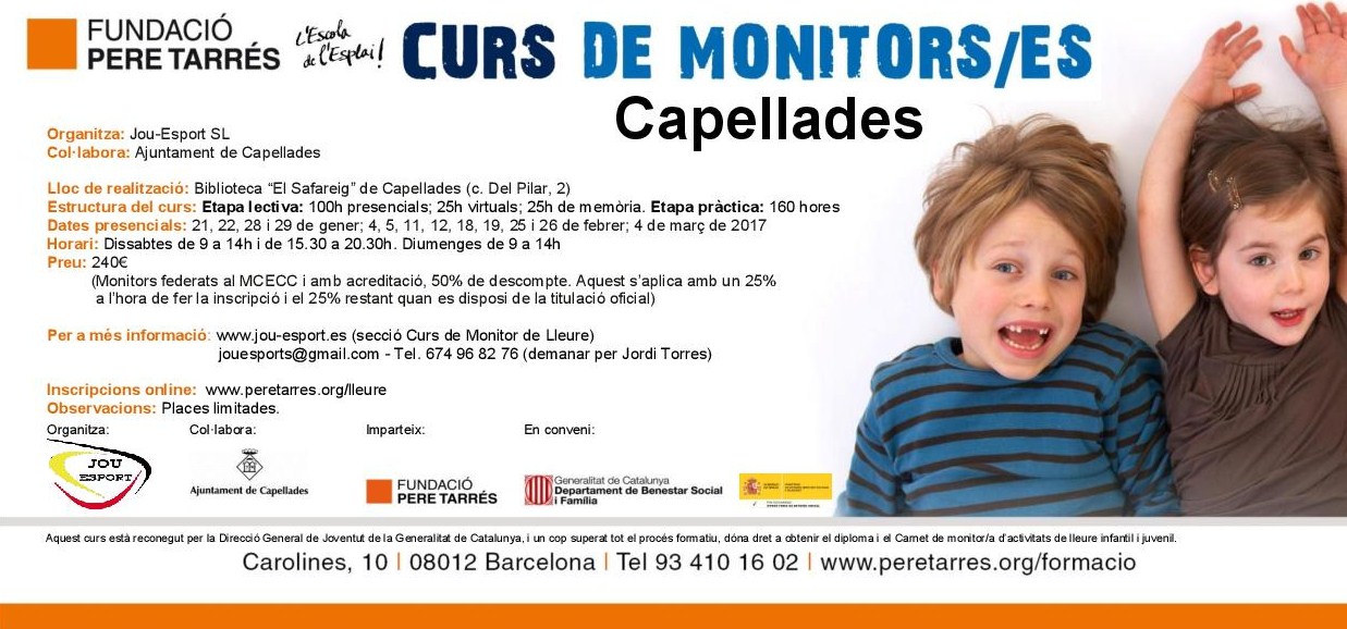 portiu Jou-Esport SL, juntament amb la col·laboració de l’Ajuntament de Capellades, organitza el curs de monitor/a de lleure a càrrec de la Fundació Pere Tarrés a la Biblioteca “El Safareig” de Capellades (c. Del Pilar,2).