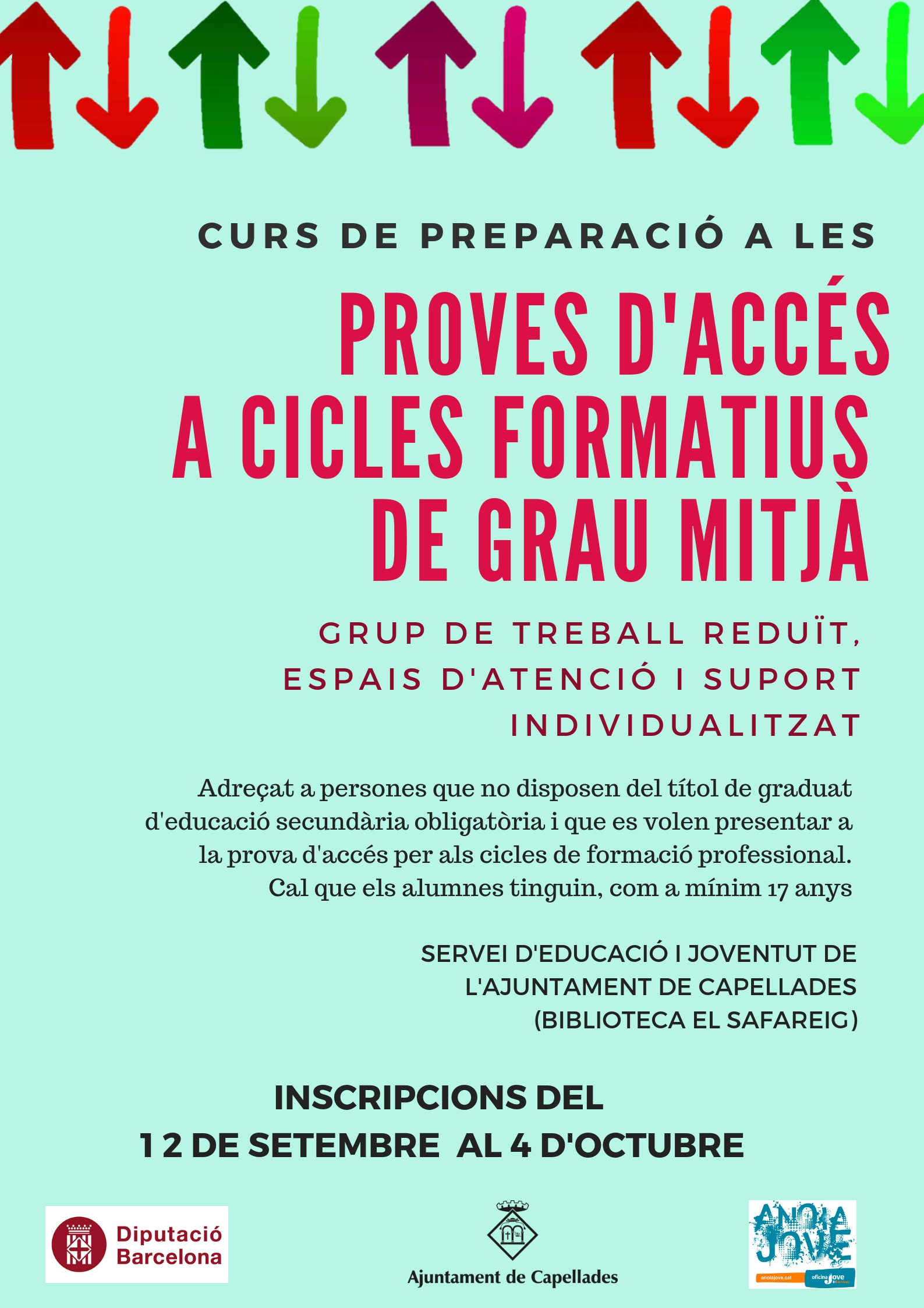 L’Ajuntament de Capellades obre inscripcions per al curs de preparació a les proves d’accés als cicles formatius de grau mig. Adreçat a persones que no disposen del títol de graduat d’educació secundària obligatòria i que es volen presentar a la prova d’accés per als cicles de formació professional. Cal que els alumnes tinguin, com a mínim 17 anys.