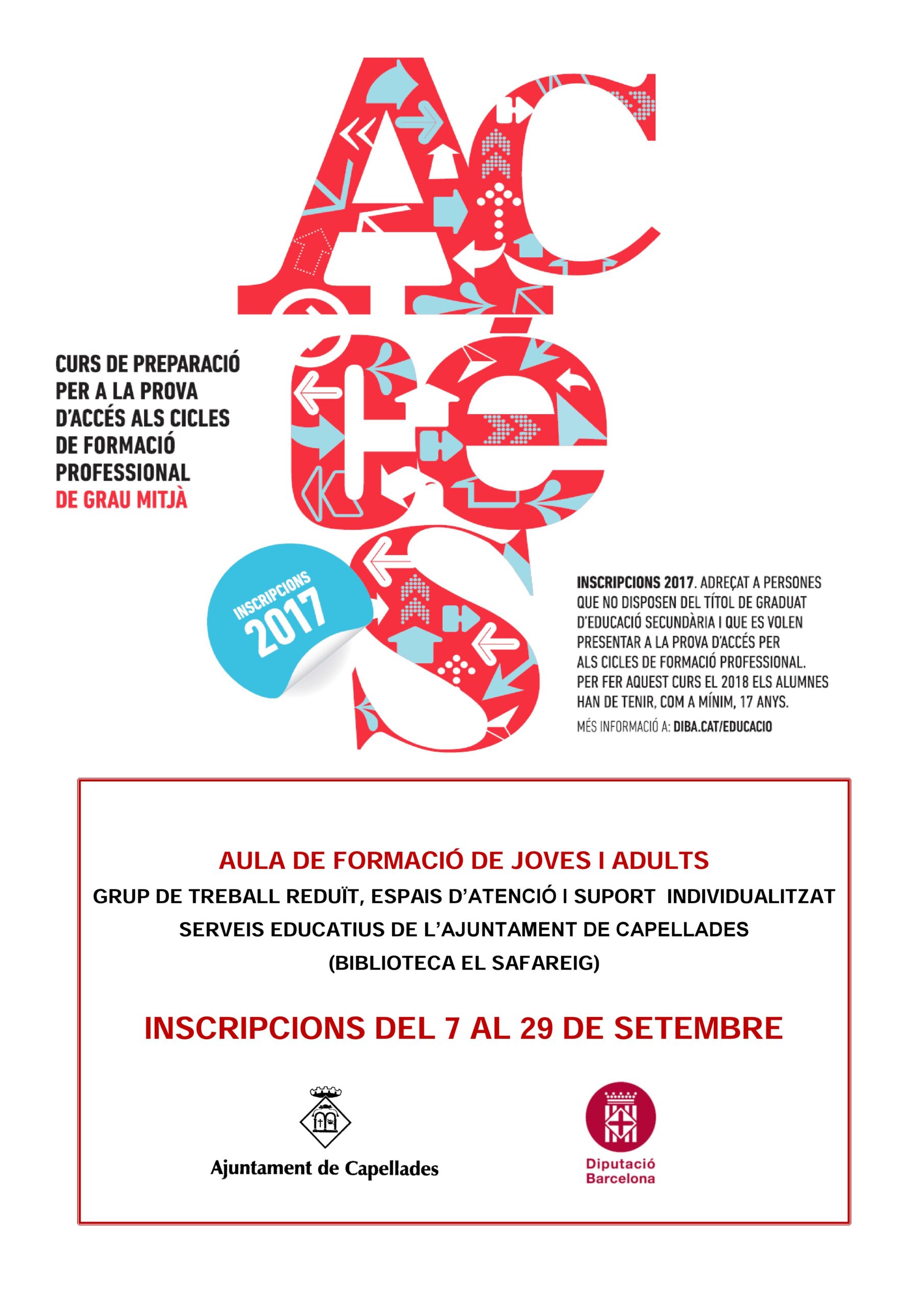 EL 7 de setembre, l’Ajuntament de Capellades obre les inscripcions per al curs de preparació de la prova d’accés a Grau Mitjà 2017/2018, amb un preu de 50€.