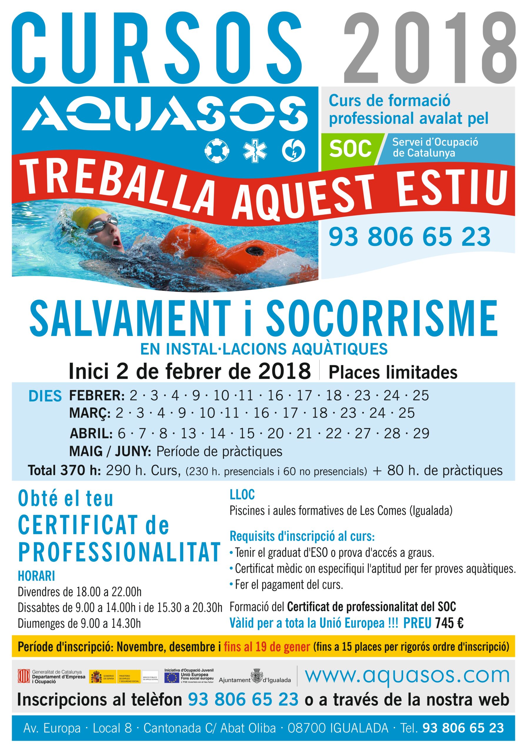 Aquest curs està avalat pel SOC i permet treballar a qualsevol instal·lació aquàtica de Catalunya que requereixi un socorrista aquàtic.