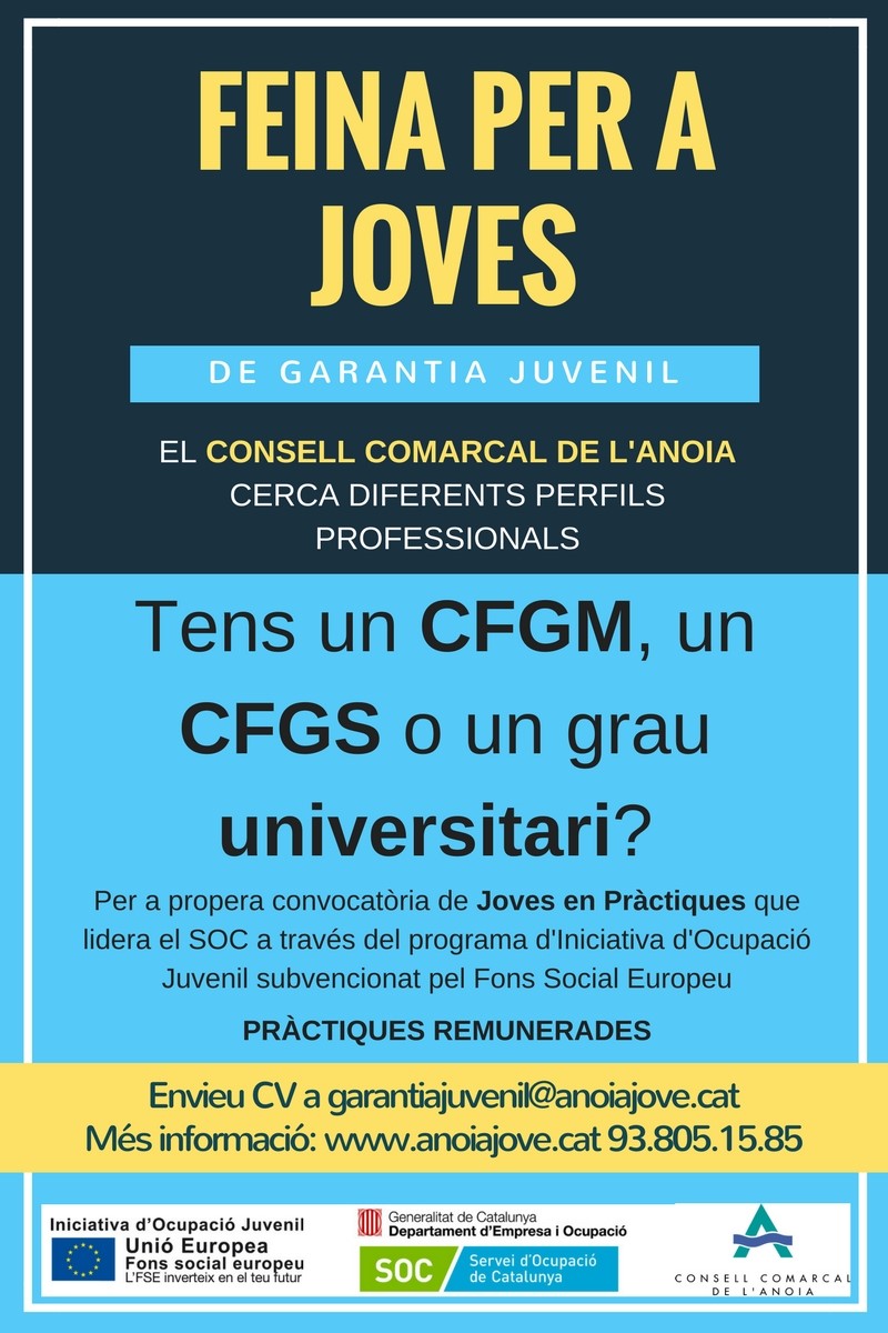 Si esteu interessats/es en fer pràctiques remunerades al Consell Comarcal de l’Anoia podeu enviar el vostre Curriculum Vitae a la següent adreça de correu electrònic: garantia juvenil@anoiajove.cat
