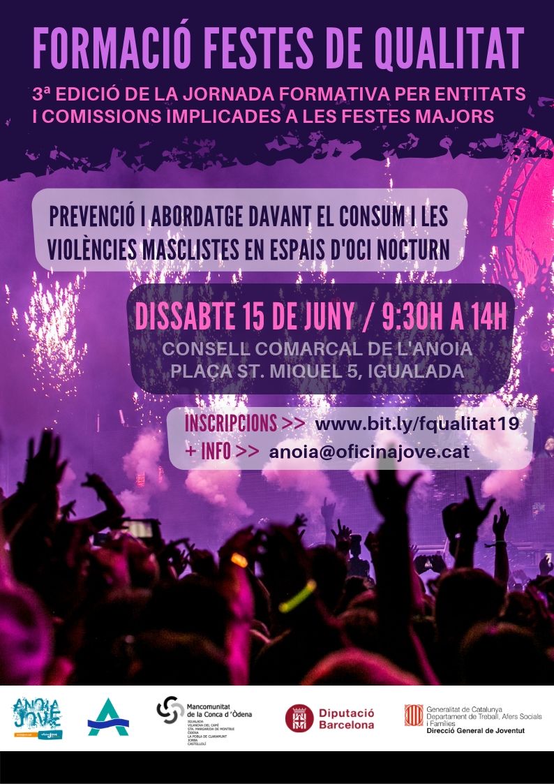 Des del Servei Comarcal de Joventut de l’Anoia i dins del marc del programa GPS Jove (Grup Promoció Salut), juntament amb l’Àrea d’Igualtat de Gènere i LGTBI de la Mancomunitat de la Conca d’Òdena, posem en marxa la 3a edició de la  formació per entitats i joves de la comarca: Festes de Qualitat amb la intenció d’apoderar els i les joves com a agents actius i transformadors de certes dinàmiques relacionades amb l’oci nocturn.
