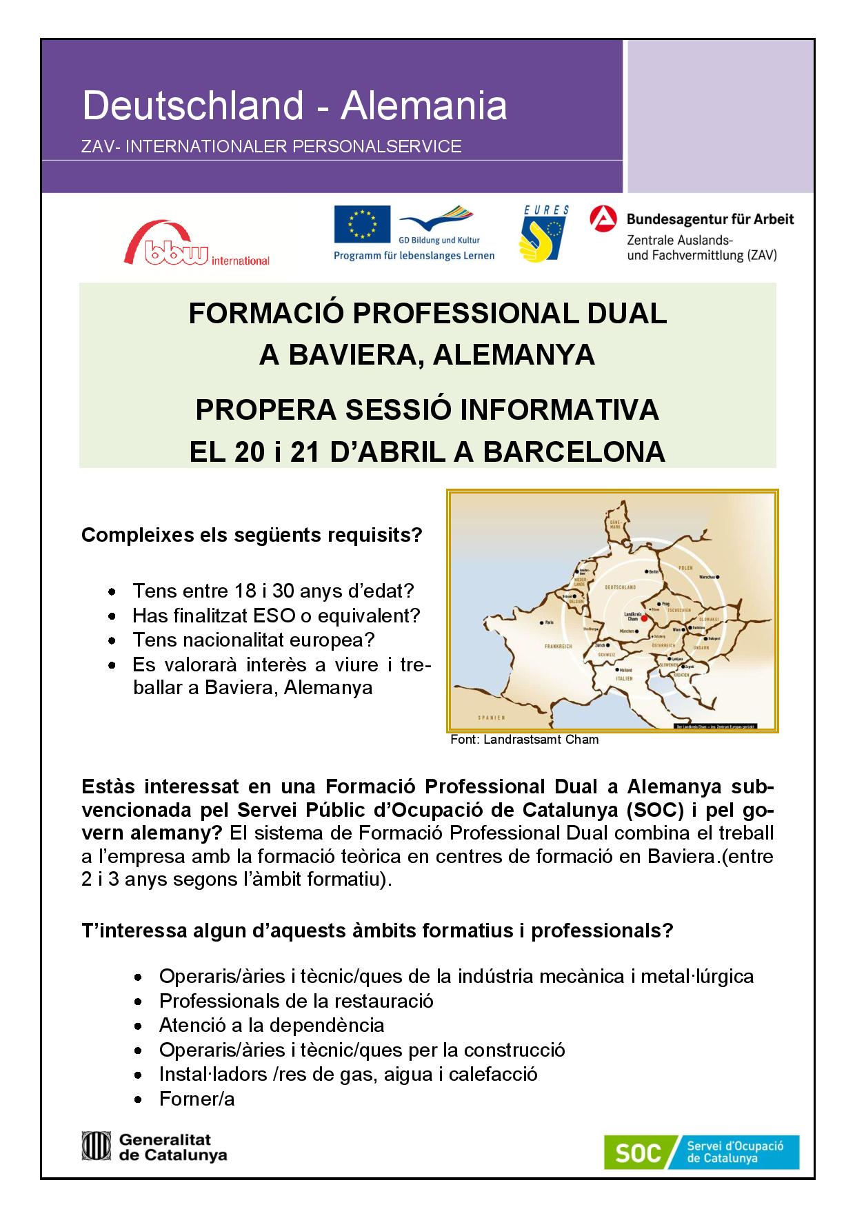 El SOC ha iniciat un procés de selecció adreçat a joves que tinguin interès per estudiar i treballar a Baviera en el marc del programa federal de Formació Dual a Alemanya i del conveni signat entre els governs de Catalunya i Baviera. Com és habitual aquest projecte compta amb el suport de la xarxa EURES i del Servei Públic d’Ocupació d’Alemanya.