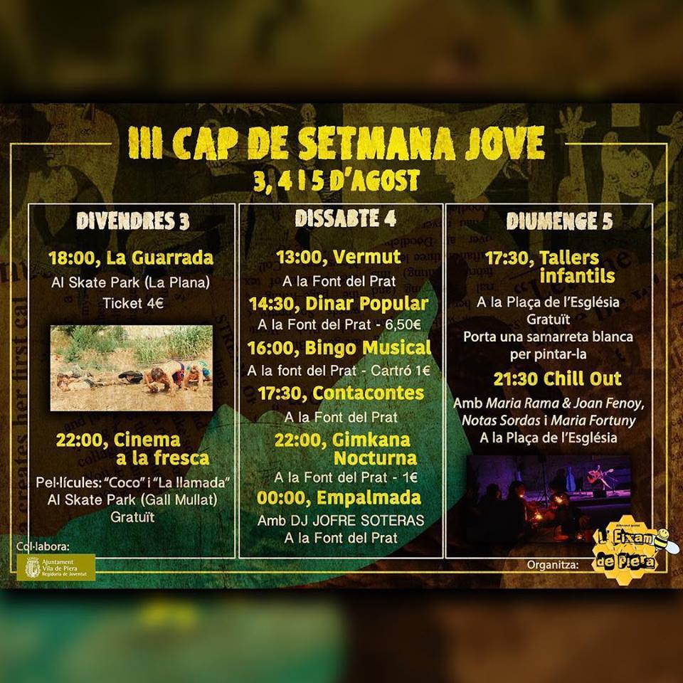 L’Eixam de Piera organitza el Cap de Setmana Jove que es celebrarà els dies 3, 4 i 5 d’agost on podreu participar de diferents activitats: