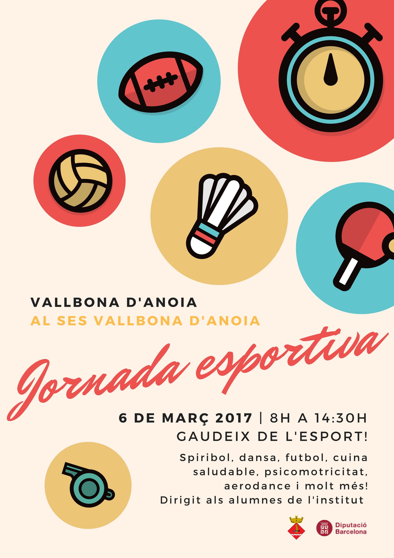 El proper dilluns, 6 de març, l’Institut i l’ajuntament de Vallbona (regidoria de joventut i Esports) organitzen la Jornada Esportiva, plena d’activitats diverses per gaudir de l’esport: Spiribol, dansa, futbol, tallers de cuina saludables, aerodance i molt més!