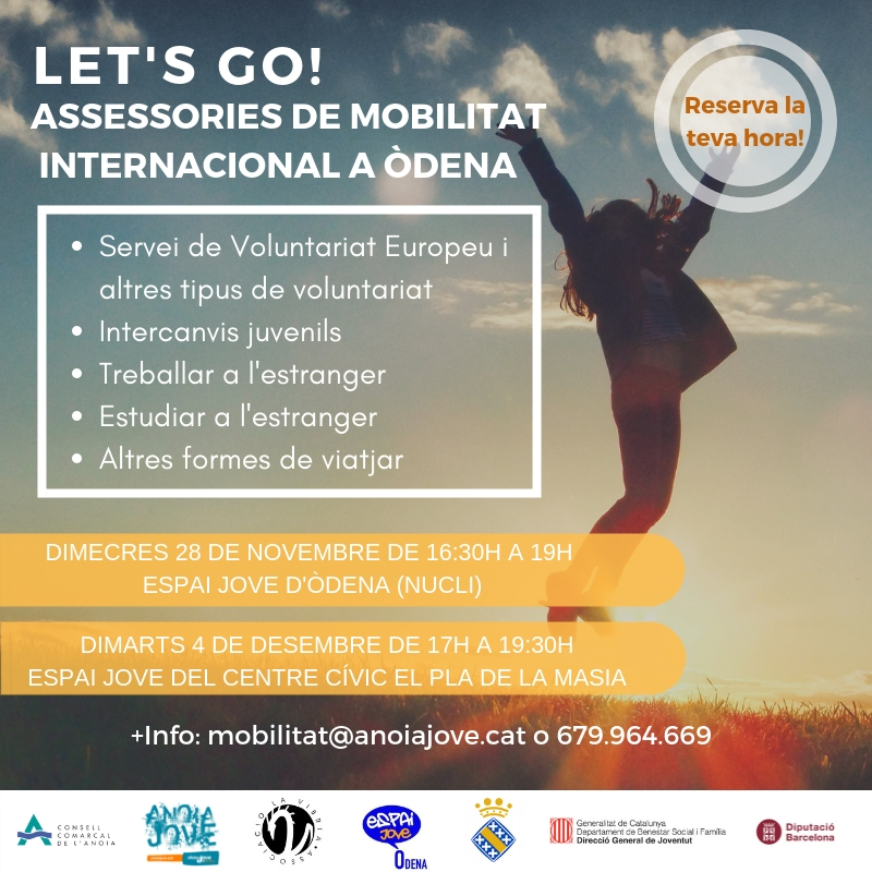 L’Assessoria de Mobilitat Internacional de l’Oficina Jove de l’Anoia (Let’s Go) serà al municipi d’Òdena el proper dimecres 26 de novembre a l’Espai Jove d’Òdena (nucli) de 16:30h a 19h i dimarts 4 de desembre a l’Espai Jove del Centre Cívic el Pla de la Masia de 17h a 19:30h. Caldrà demanar cita prèvia enviant un correu electrònic a anoia@oficinajove.cat, un missatge de Whatsapp al 679.964.669 o bé trucant al 93.805.15.85 ext.2.
