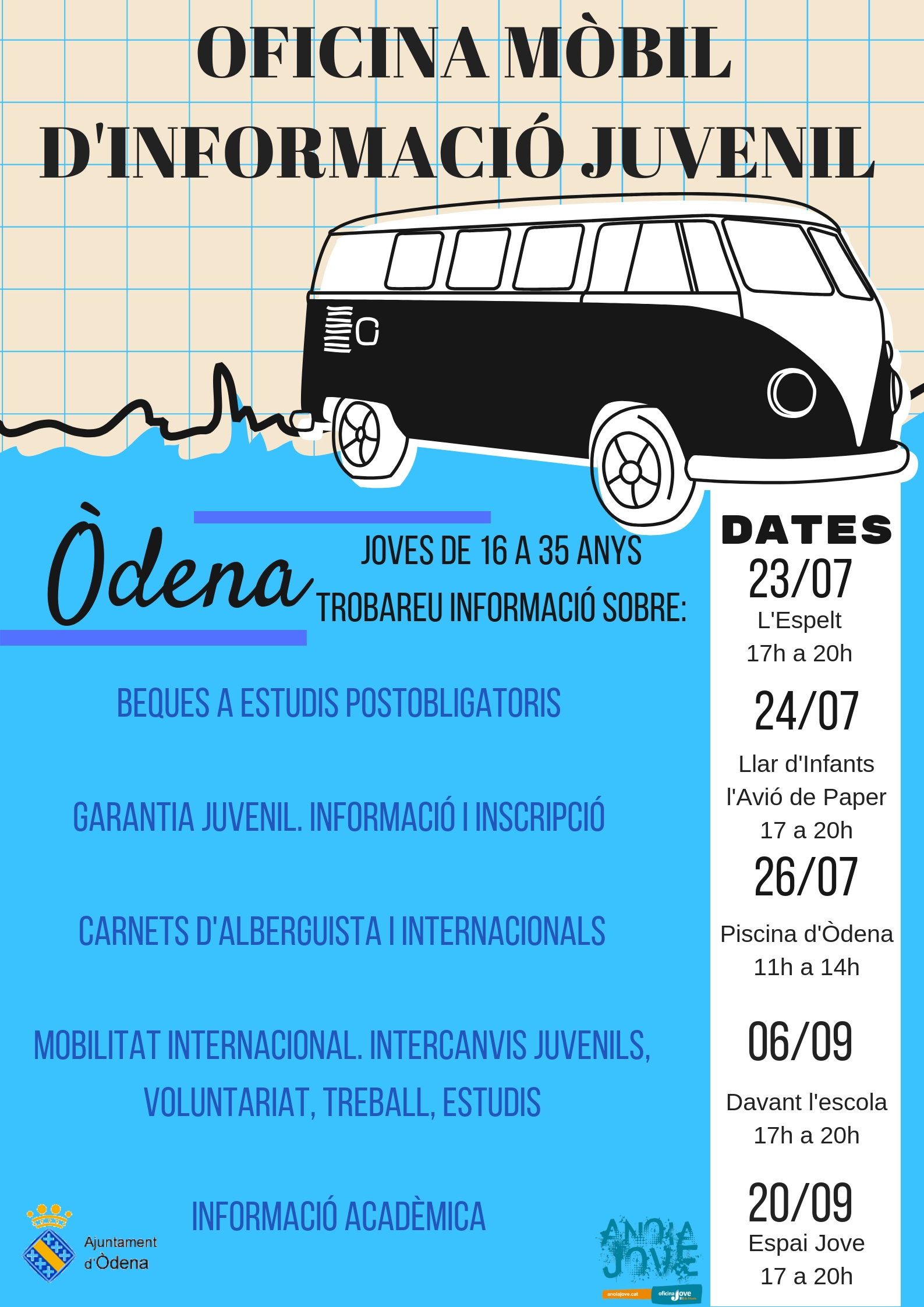 Gràcies al conveni subscrit entre el Servei Comarcal de Joventut del Consell i l’Ajuntament d’Òdena, l’Oficina Mòbil d’Informació Juvenil farà parada, coincidint amb la setmana de la Joventut i l’Esport els següents dies: