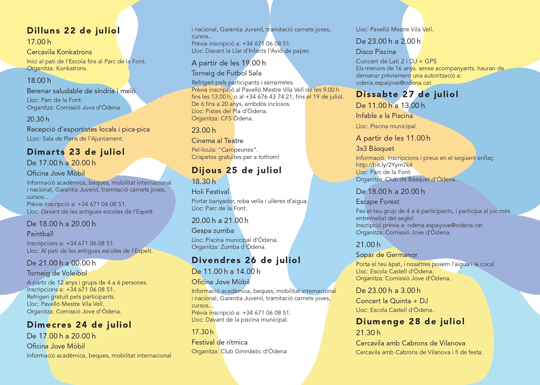 Del 22 al 28 de juliol es celebrarà la Setmana de la Joventut i de l’Esport d’Òdena 2019. Aquesta setmana comptarà amb diferents activitats des de Cinema, 3×3 de Bàsquet, Holi Festival, Paintball, concerts, etc.