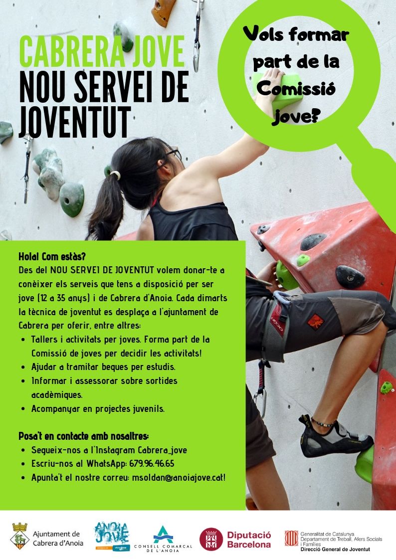 Des de l’Ajuntament de Cabrera d’Anoia iniciem el Nou Servei de Joventut per joves 12 a 35 anys. Cada dimarts la tècnica de joventut del Consell Comarcal de l’Anoia es desplaça a l’ajuntament de Cabrera per oferir, entre altres: