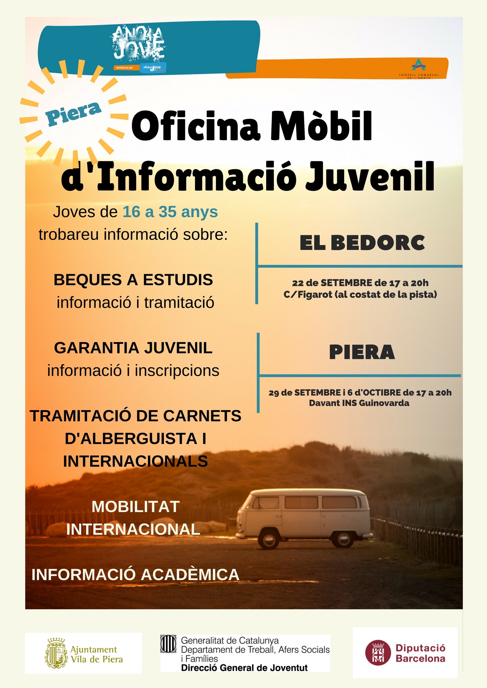 Gràcies al conveni subscrit entre el Servei Comarcal de Joventut del Consell i l’Ajuntament de Piera, l’Oficina Mòbil d’Informació Juvenil farà parada al Bedorc, al C/ Figarot, el divendres 22 de setembre i al nucli urbà de Piera, davant de l’INS Guinovarda, els divendres 29 de setembre i 6 d’octubre. L’horari serà de 17 a 20h.