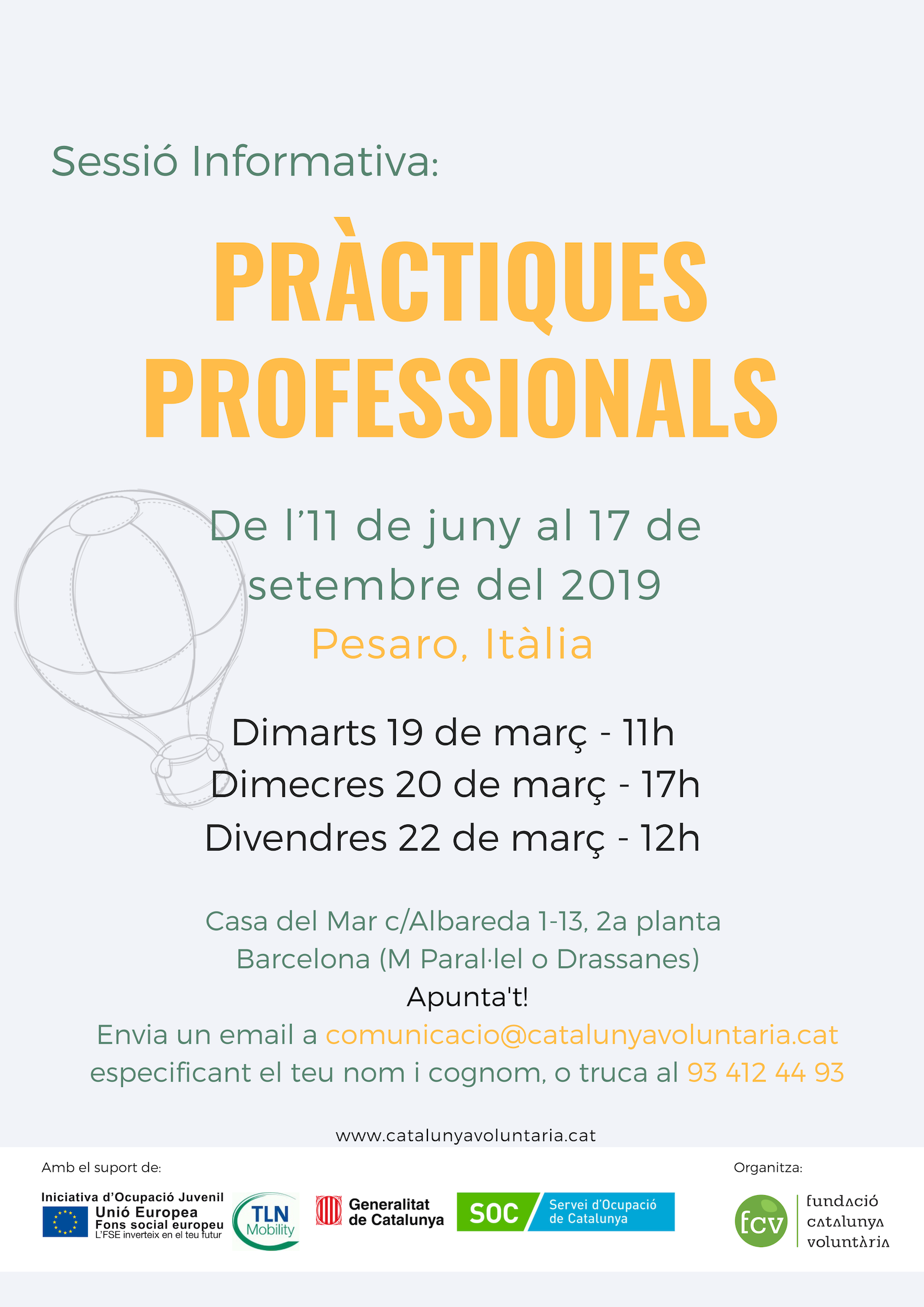 La Fundació Catalunya Voluntària realitza diferents sessions informatives durant el mes de març per donar a conèixer tota la informació sobre el projecte “Ampliant Horitzons: Pràctiques Professionals a Europa” en el marc del programa TLN Mobilicat, del Servei d’Ocupació de Catalunya -SOC i Fons Social Europeu, i que ofereix la possibilitat de realitzar unes pràctiques professionals per tal de tenir una experiència de feina real, en un altre país europeu, dins del sector professional escollit.