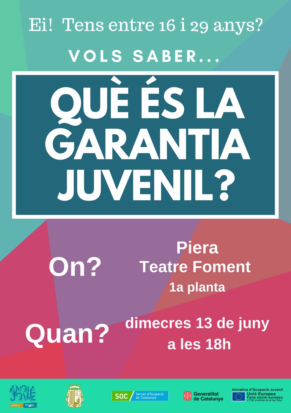 L’Ajuntament de Piera, a través de l’Oficina Jove de l’Anoia, ofereix una xerrada per informar als i les joves del municipi sobre la Garantia Juvenil. Aquesta xerrada va dirigida a joves de 16 a 29 anys i donarà a conèixer aquesta inicativa i les oportunitats que ofereix: formació, pràctiques laborals i autoocupació.