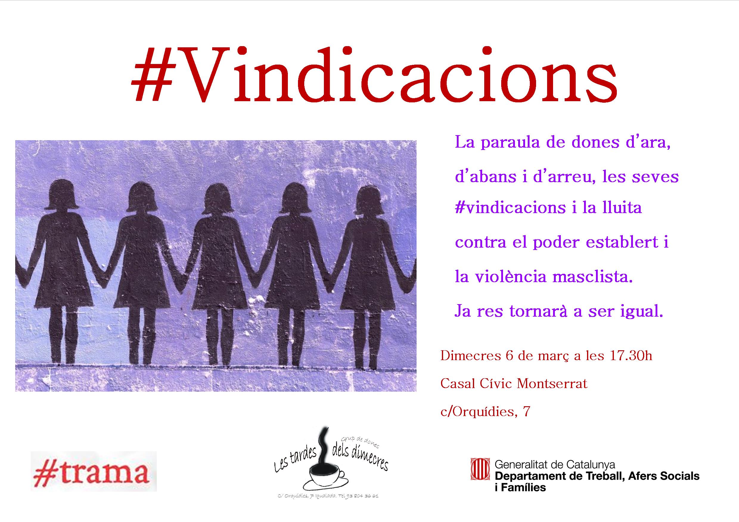 En motiu del dia de la dona treballadora, el dia 6 de març a les 17:30h al Casal Cívic Montserrat conjuntament amb l’associació Grup de dones de les tardes del dimecres, realitzaran l’obra de teatre Vindicacions de la mà de Plataforma Unitària contra la Violència de Gènere (Trama SCCL). En l’obra, a través de dos personatges molt diferents entre si, ens endinsarem en les diferents discriminacions i desigualtats de gènere tot barrejant l’humor, el drama i l’anàlisi crítica.