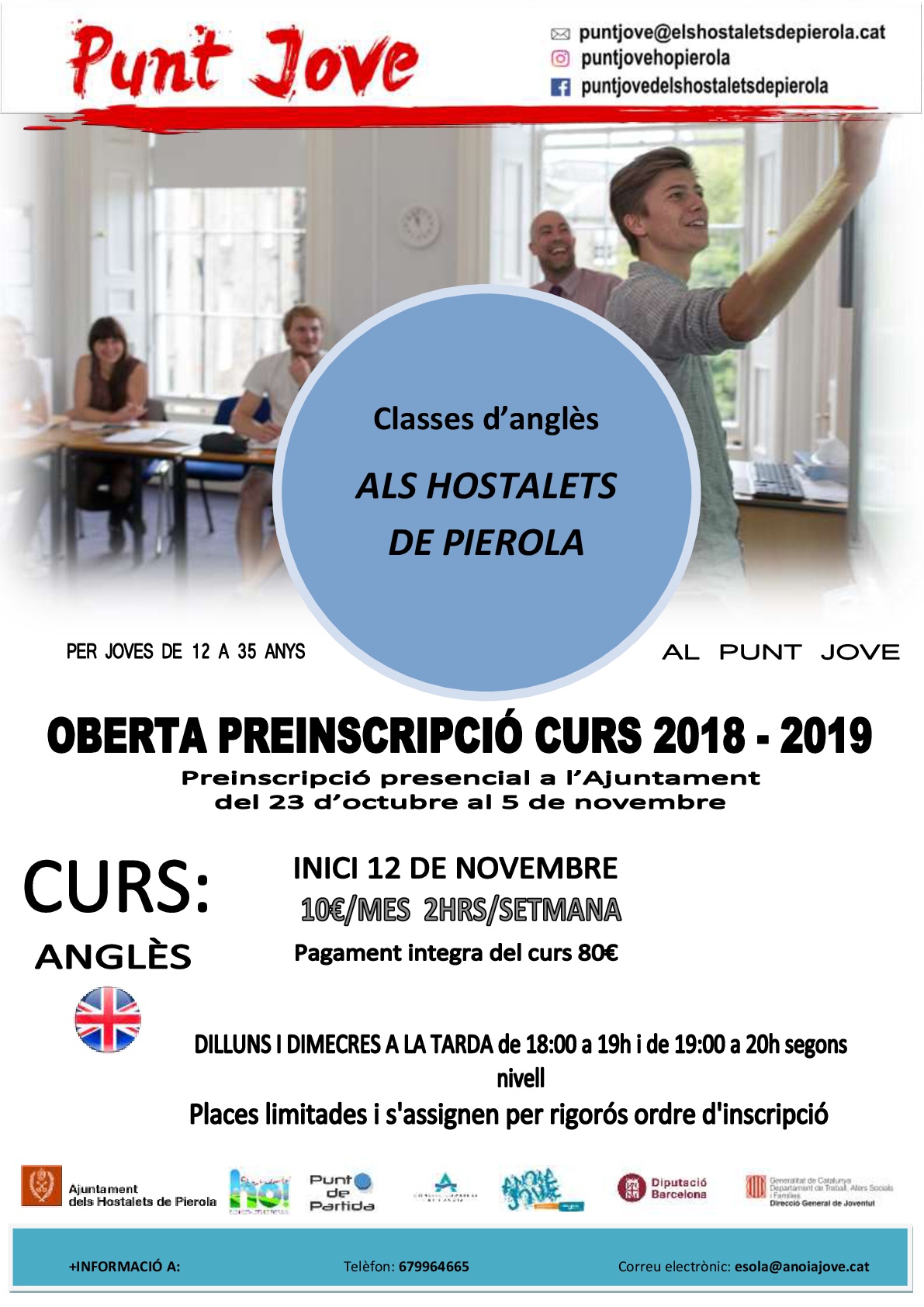 El curs es farà en horari de dilluns i dimecres a la tarda de 18h a 19h o de 19h a 20h segons el nivell. Les classes s’iniciaran el 12 de novembre! El preu són 10€ al mes per 2 hores setmanals. Per fer la preinscripció pots anar directament a l’ajuntament d’Hostalets de Pierola.
