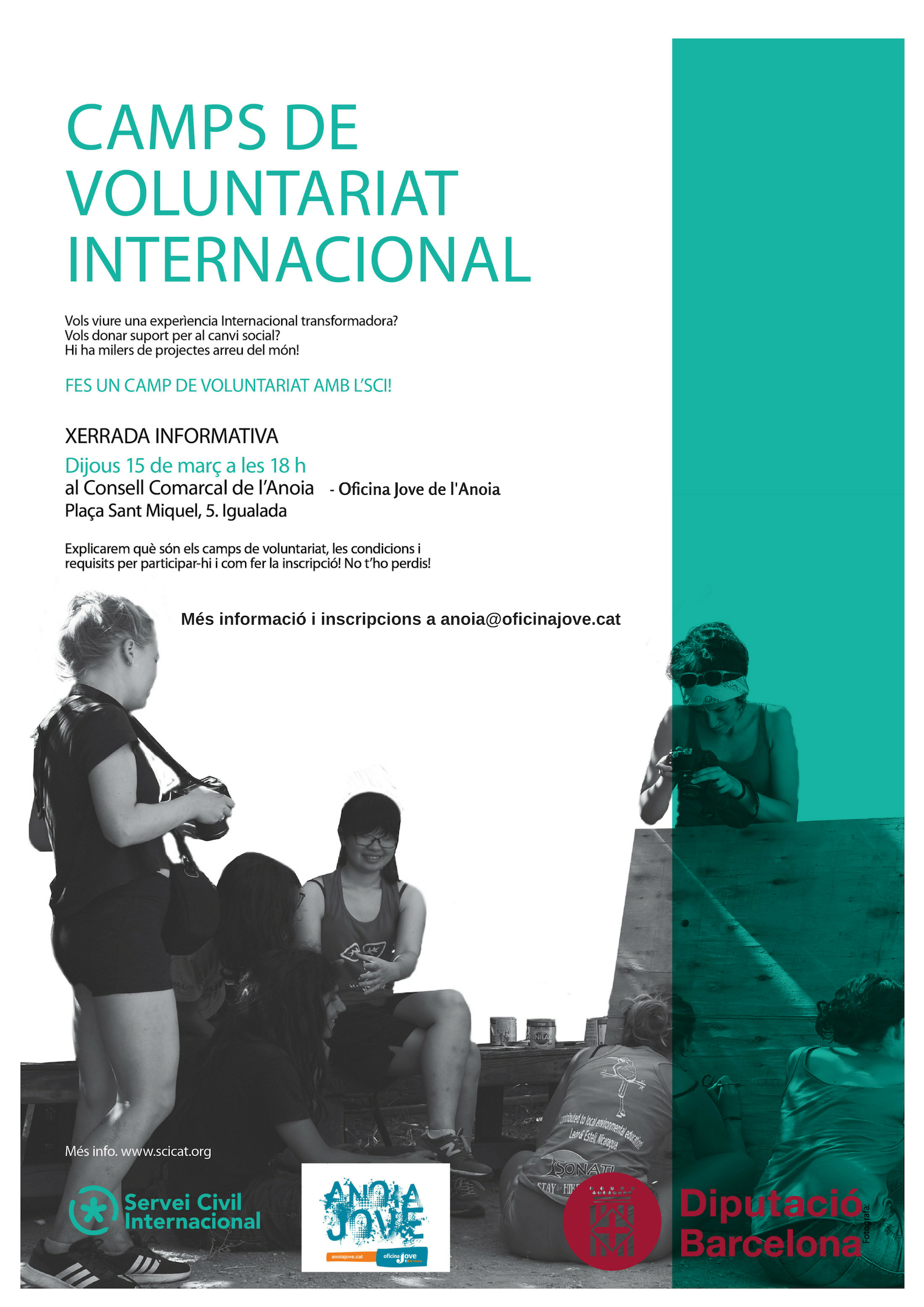 El dijous 15 de març a les 18h tindrà lloc una xerrada sobre els camps de voluntaritat (camps de treball) de l’SCI. En aquesta xerrada ens informaran de les opcions, dels procediments i del seu funcionament. A més, participaran voluntaris d’altres anys que ens explicaran la seva experiència i consells pràctics.