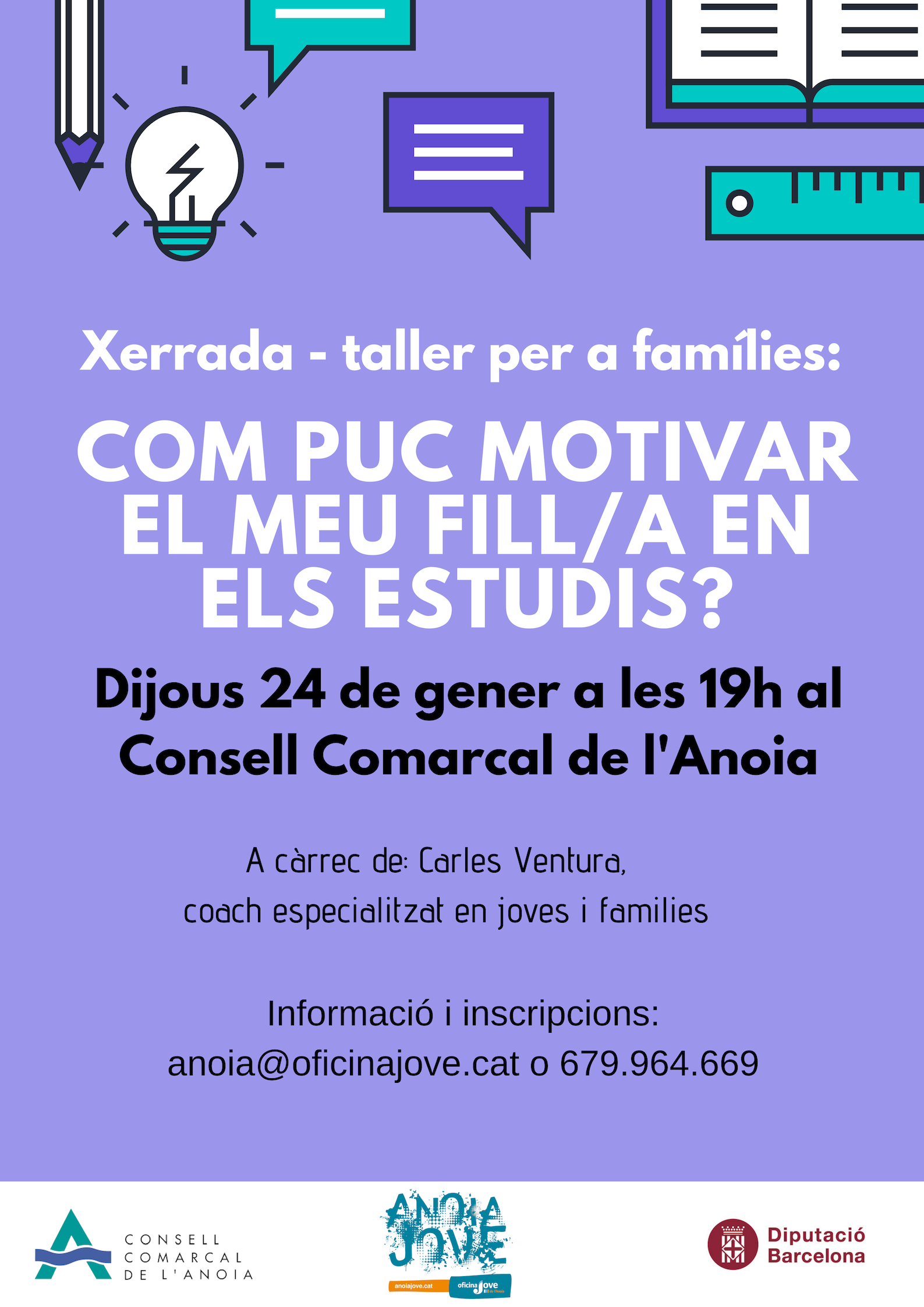 La xerrada – taller tindrà lloc el proper dijous 24 de gener a les 19:00h a la seu del Consell Comarcal de l’Anoia (Plaça Sant Miquel, 5 d’Igualada) i anirà a càrrec de Carles Ventura, Coach especialitzat en joves i les seves famílies amb els quals treballa la seva autoestima, motivació, les relacions interpersonals i la presa de decisions. Podeu fer la vostra inscripció omplint el següent formulari.