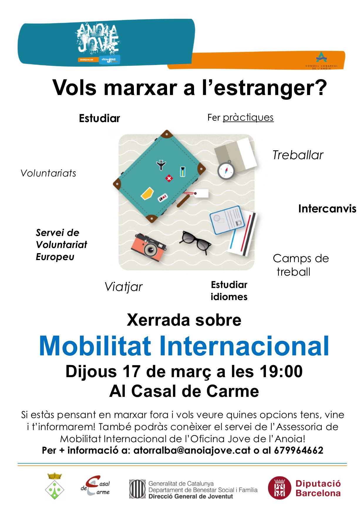 Dijous 17 de març a les 19:00 de la tarda al Casal de Carme el Punt Jove organitza una xerrada sobre Mobilitat Internacional i les diferents opcions que hi ha: voluntariats, estudiar, treballar i fer pràctiques, camps de treball, Servei de Voluntariat Europeu, intercanvis, etc. La sessió la durà a terme l’Assessoria de Mobilitat Internacional de l’Oficina Jove de l’Anoia! No t’ho perdis!!